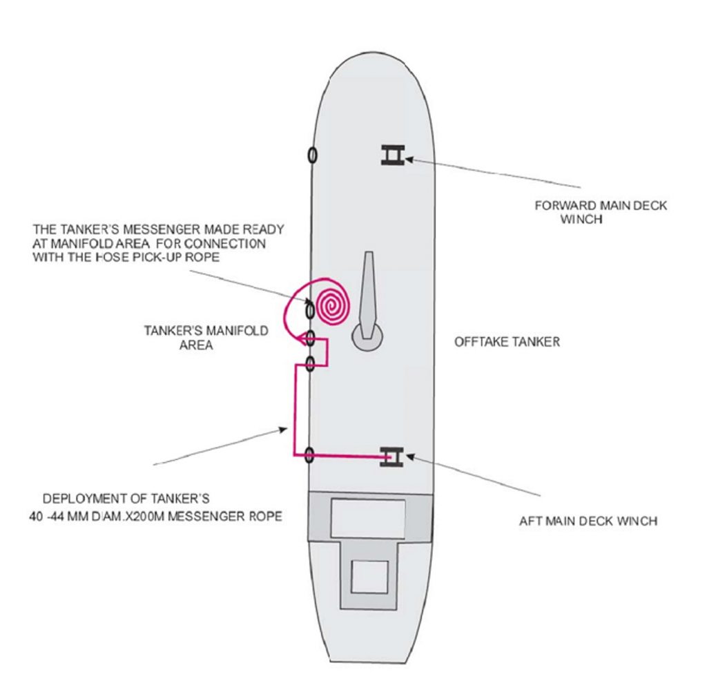 - Deployment of Tanker’s messenger 24 – 36mm x 200m as sketch below for Semi-boatless hose transfer. The Aft main deck windlass (Aft spring winch)’s drum must be empty and ready to heave.